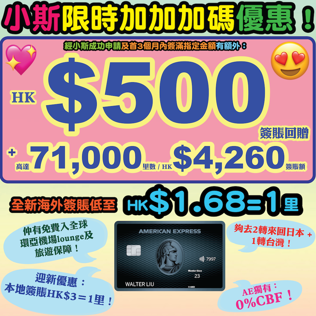 小斯限時加碼優惠!AE Explorer旅遊神卡送加碼優惠比大家!!想賺大額里數換機票嘅,機會嚟啦!只要喺2026年2月20日至3月1日經小斯成功申請,迎新最高可以賺HK$500 簽賬回贈 +71,000里,夠換雙人來回日本機票!今次迎新優惠繼續俾大家賺大額里數,包括有本地簽賬升級到HK$3=1里,上限仲大大提高,準備有大額簽賬、結婚擺酒、搬屋裝修就更加要申請!!再加上繼續有登記海外簽賬優惠低至HK$1.68=1里^!