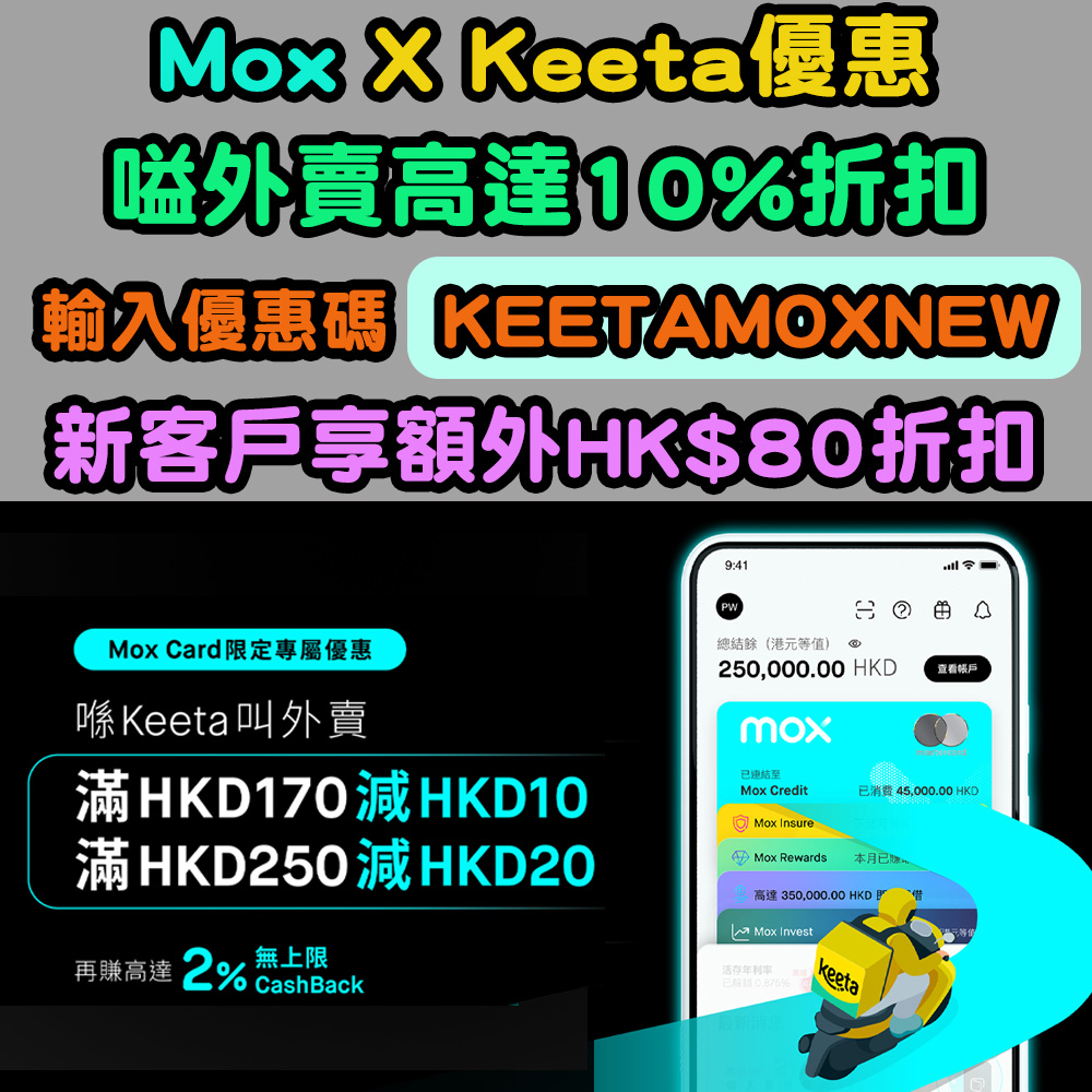放假唔想煮飯,又要搞Party?嗌Keeta外賣就可以賺住玩餐飽!只要你有Mox Card就可以專享呢個全城獨家優惠,由即日起至2026年4月30日,就有以下優惠: