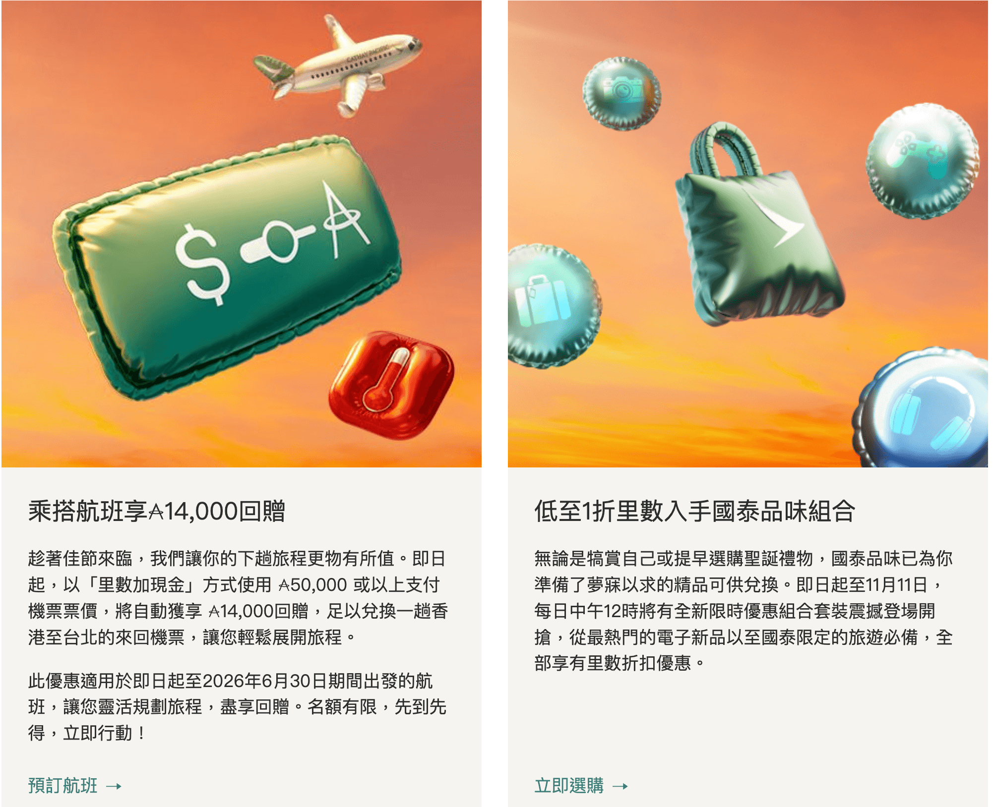 2025年11月3日至11日,將有多個組合套裝優惠震撼登場,更會連續9天每日中午解鎖超人氣產品組合,包括國泰限定商品、智能新品、旅遊必備及驚喜神秘組合套裝等,限量尊享低至1折里數優惠!