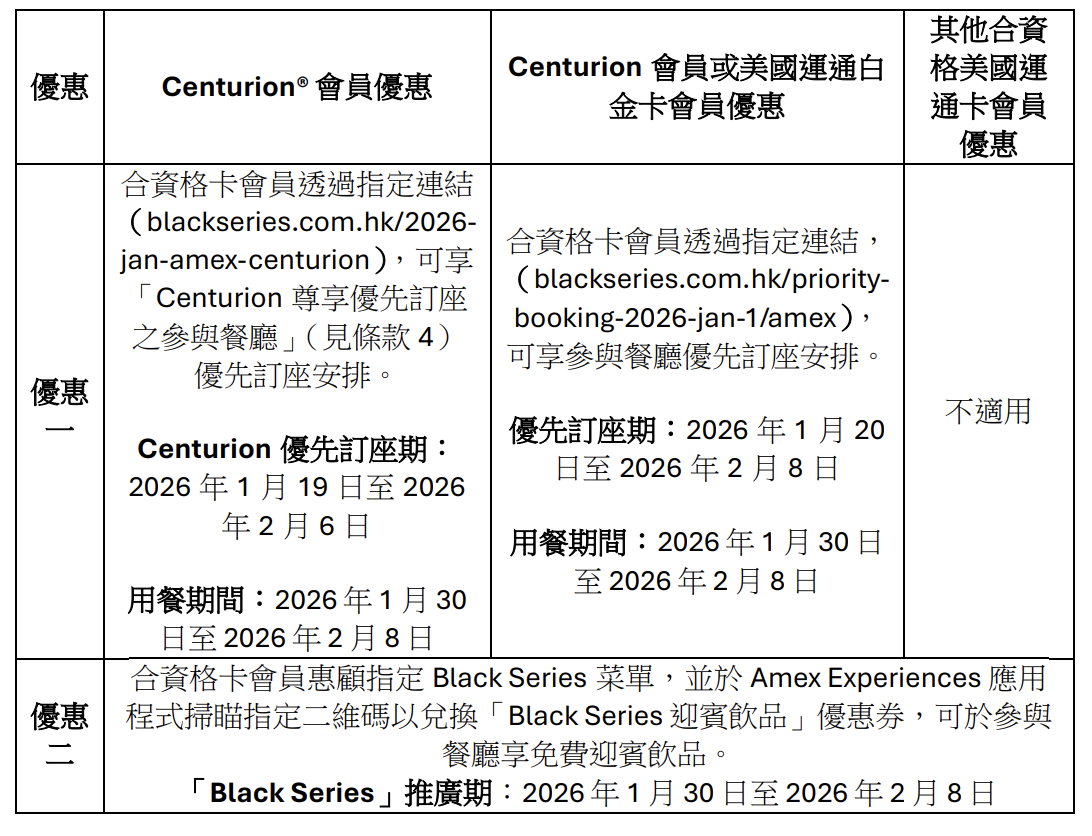 2. Centurion 優先訂座為(「Centurion 尊享優先訂座」)2026 年 1 月 19 日至 2026 年 2 月 6 日(包括首尾兩天)(「Centurion 優先訂座期)」。優先訂座(「優先訂座」) 為 2026 年 1 月 20 日至 2026 年 2 月 8 日(包括首尾兩天)(「優先訂座期」) (以上 統稱「優惠一」)。「「Black Series」推廣期為 2026 年 1 月 30 日至 2026 年 2 月 8 日 (包括首尾兩天)(「Black Series」推廣期)(「優惠二」)。