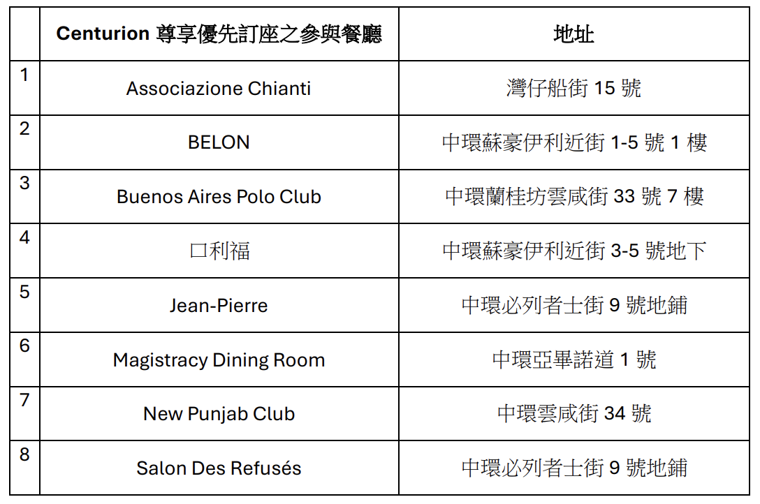 4. Centurion 尊享優先訂座之參與餐廳如下: