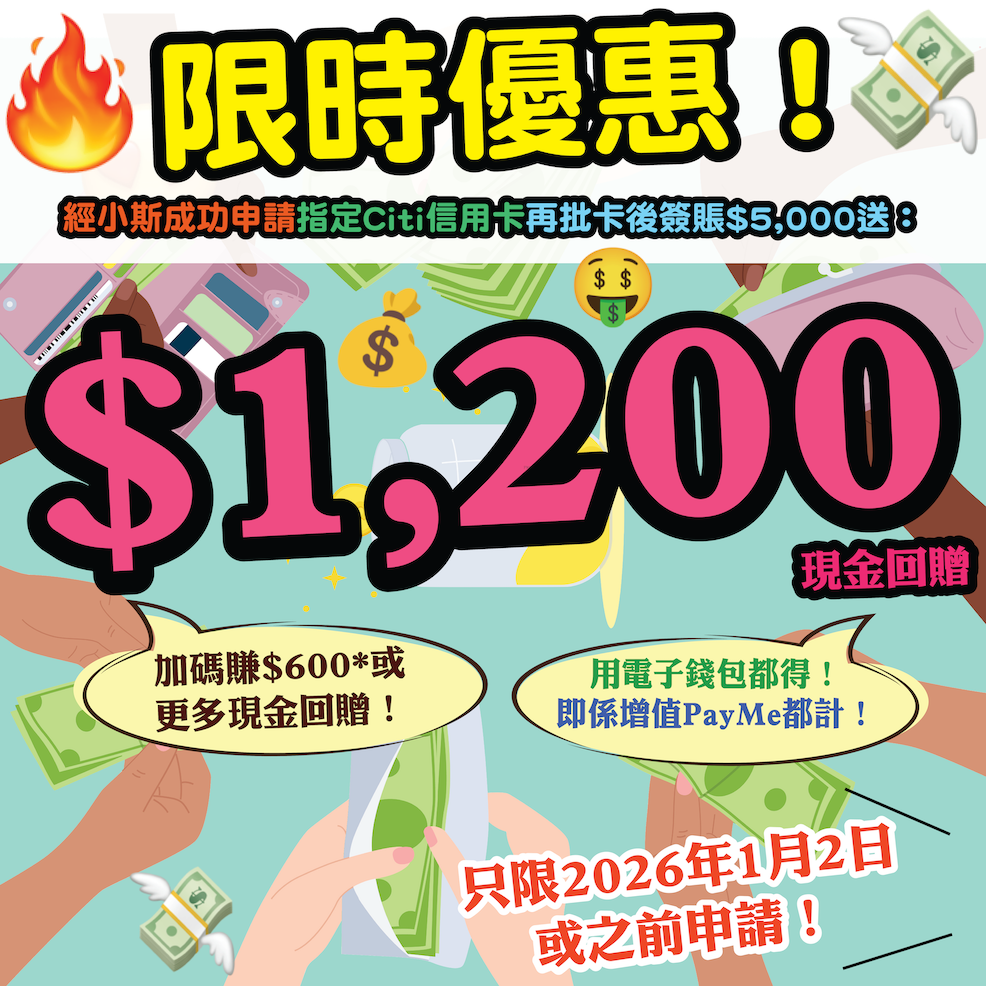 $1,200現金回贈 (2025年12月2日至2026年1月2日期間申請既新客戶):不用填寫google form!新客戶使用指定連結於2025年12月2日至2026年1月2日期間申請 Citi Rewards 信用卡 或 Citi Cash Back Mastercard 或 Citi HKTVMALL信用卡,並於2026年2月2日或之前批核,及於信用卡批核後2個月內再簽夠$5,000,咁就有$1,200現金回贈!會由Citi直接送出!$1,200會喺簽賬後5個月內入到去你Citi信用卡到!