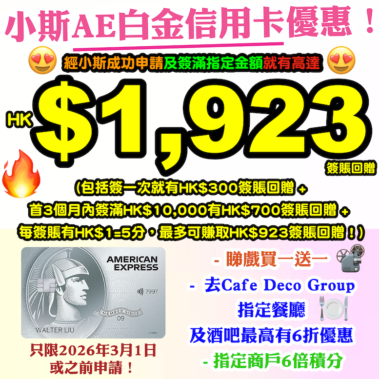 限時優惠!!!美國運通白金信用卡小斯有迎新優惠啊!!只要喺2026年2月1日至3月1日,成功經小斯申請及簽滿指定金額就有高達HK$1,923簽賬回贈!包括簽一次就有HK$300簽賬回贈 + 首3個月內簽滿HK$10,000有HK$700簽賬回贈 + 簽賬有HK$1=5分,最多賺取240,000積分!相等於HK$923簽賬回贈!