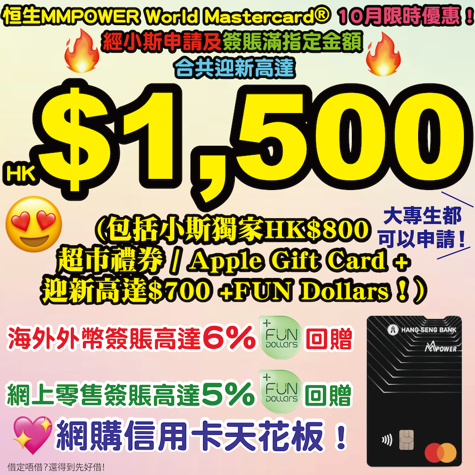 (記得要係2025年10月1日至10月31經小斯成功申請,經小斯成功申請成功批核後一個月內簽賬滿指定金額,有高達HK$800 Apple Gift Card/超市禮券啊!)