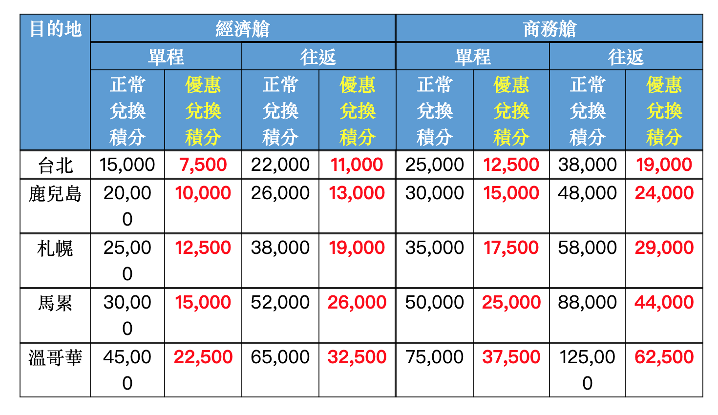 經濟艙推介既有19,000里換來回札幌、26,000里來回馬代、32,500里來回溫哥華!