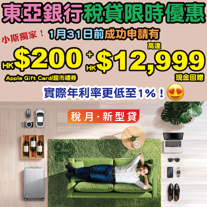 記得要喺2026年1月31日或之前成功申請東亞銀行稅季貸款並成功提取貸款,先有小斯獨家HK$200 Apple Gift Card/超市禮券 + 高達HK$12,999現金回贈^㗎!