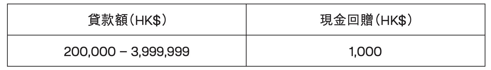 – 專業人士/公務員於推廣期內成功申請並提取稅季貸款達指定金額及還款期,可享下表所示之現金回贈。