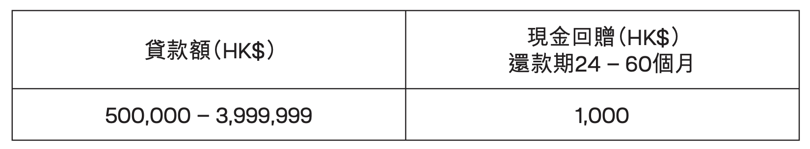 現金回贈(HK$) 還款期24 – 60個月 |