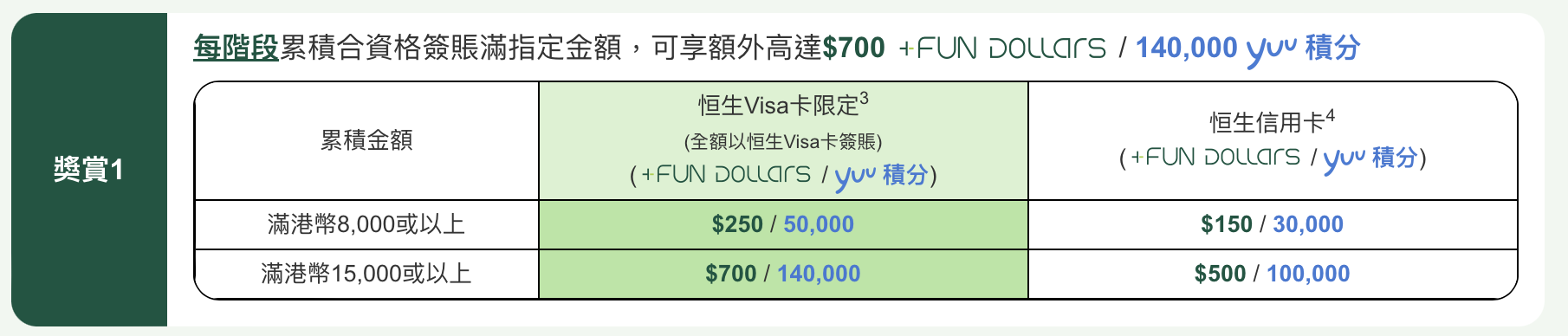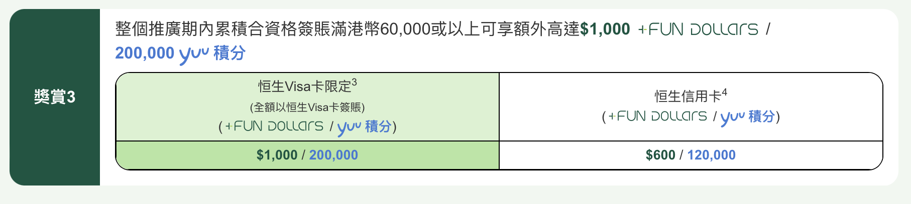 - 恒生Visa信用卡可享$1,000 +FUN Dollars / 200,000 yuu積分