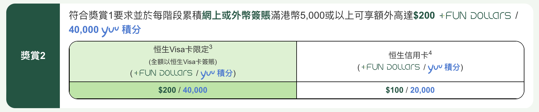 - 獎賞二:符合獎賞一要求及每階段累積網上或外幣簽賬滿港幣5,000或以上有額外高達$200 +FUN Dollars / 40,000 yuu積分