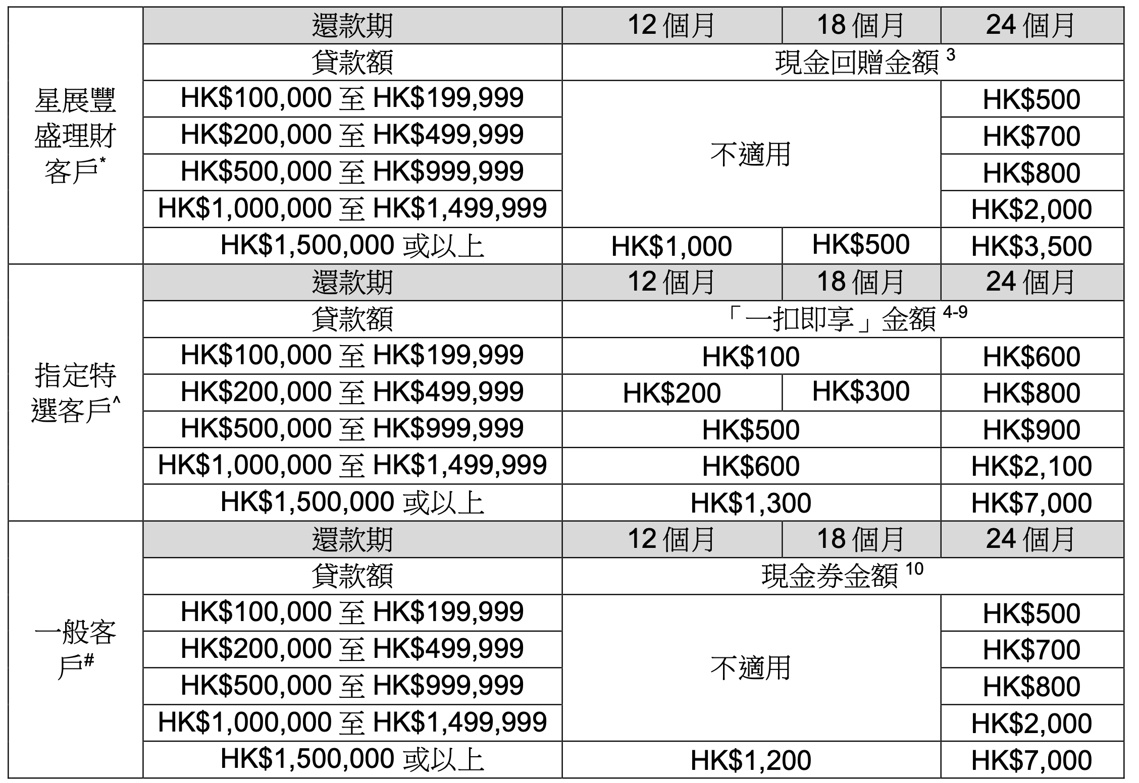 在內(「推廣期」)。 - 下述類別客戶於推廣期內成功申請星展銀行(香港)有限公司(「本行」)的星展稅季貸款 (「貸款」),並於貸款申請日起 1 個曆月內成功提取批核貸款,若貸款額達下表指定的金 額及還款期,可獲對應的現金回贈、超級市場現金券(「現金券」)或「一扣即享」金額 (分別及統稱「獎賞」)。