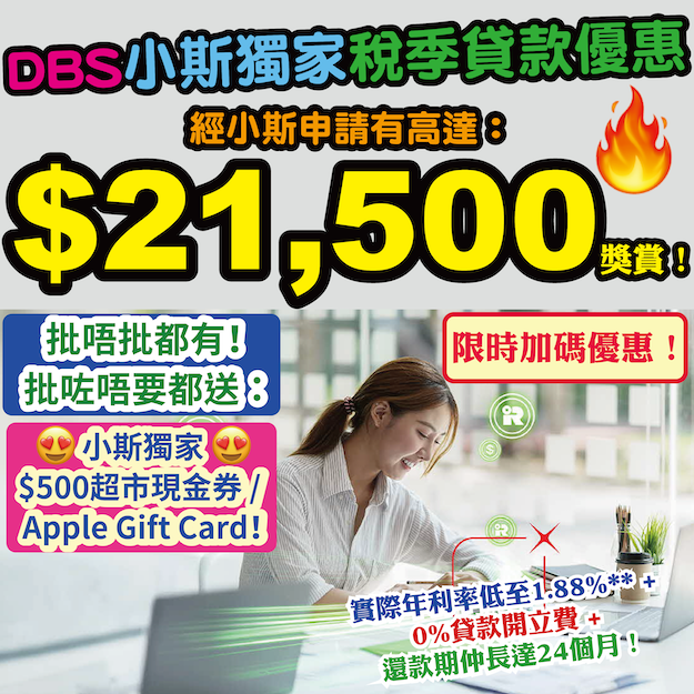 - 借夠150萬,獲小斯獨家HK$14,500超市現金券 / Apple Gift Card + DBS獎賞HK$3,500現金回贈,總共高達$18,000獎賞!
