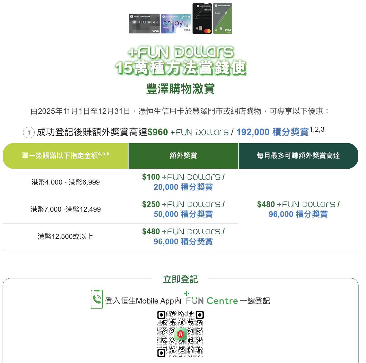 恒生信用卡同豐澤嘅簽賬優惠又黎啦!由2025年11月1日至12月31日,憑恒生信用卡於豐澤分店或網店購物,可專享以下優惠: