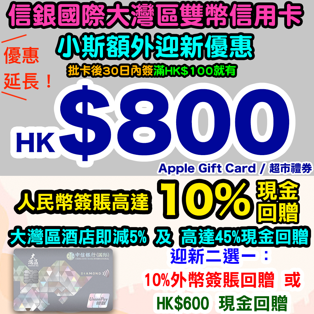 【優惠延長!信銀國際大灣區雙幣信用卡小斯優惠】全新信用卡客戶經小斯申請,批卡後30日內簽滿HK$100就有HK$800 Apple Gift Card / 超市禮券!人民幣簽賬10%現金回贈!