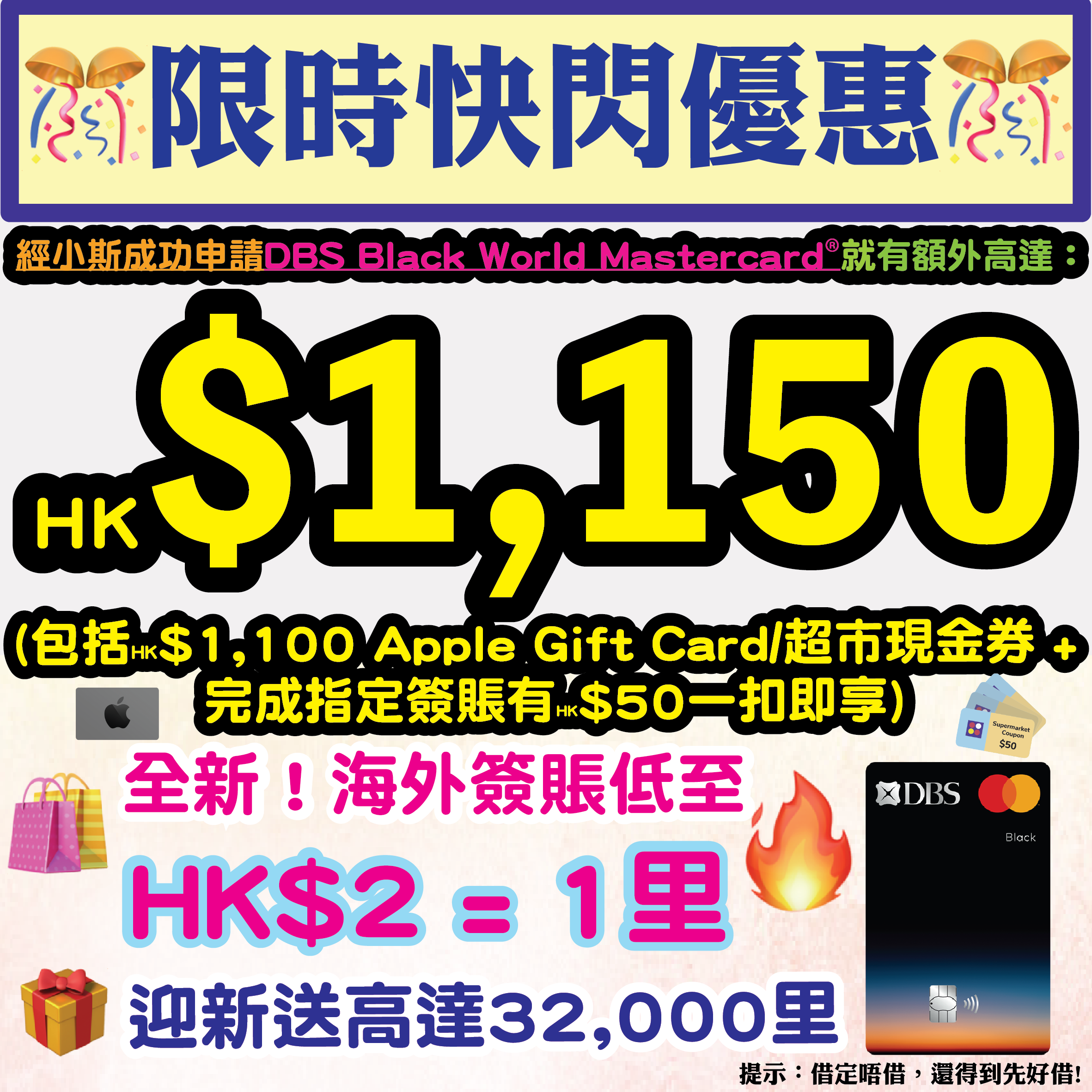 ✅小斯限時額外迎新:2025年11月6日至11月18日期間,經小斯指定連結成功申請毋須簽賬額外賺HK$1,100 Apple禮品卡 或 超市現金券(2選1),📍申請後記得批咗先填表:http://flyformiles.hk/dbs500.0821
