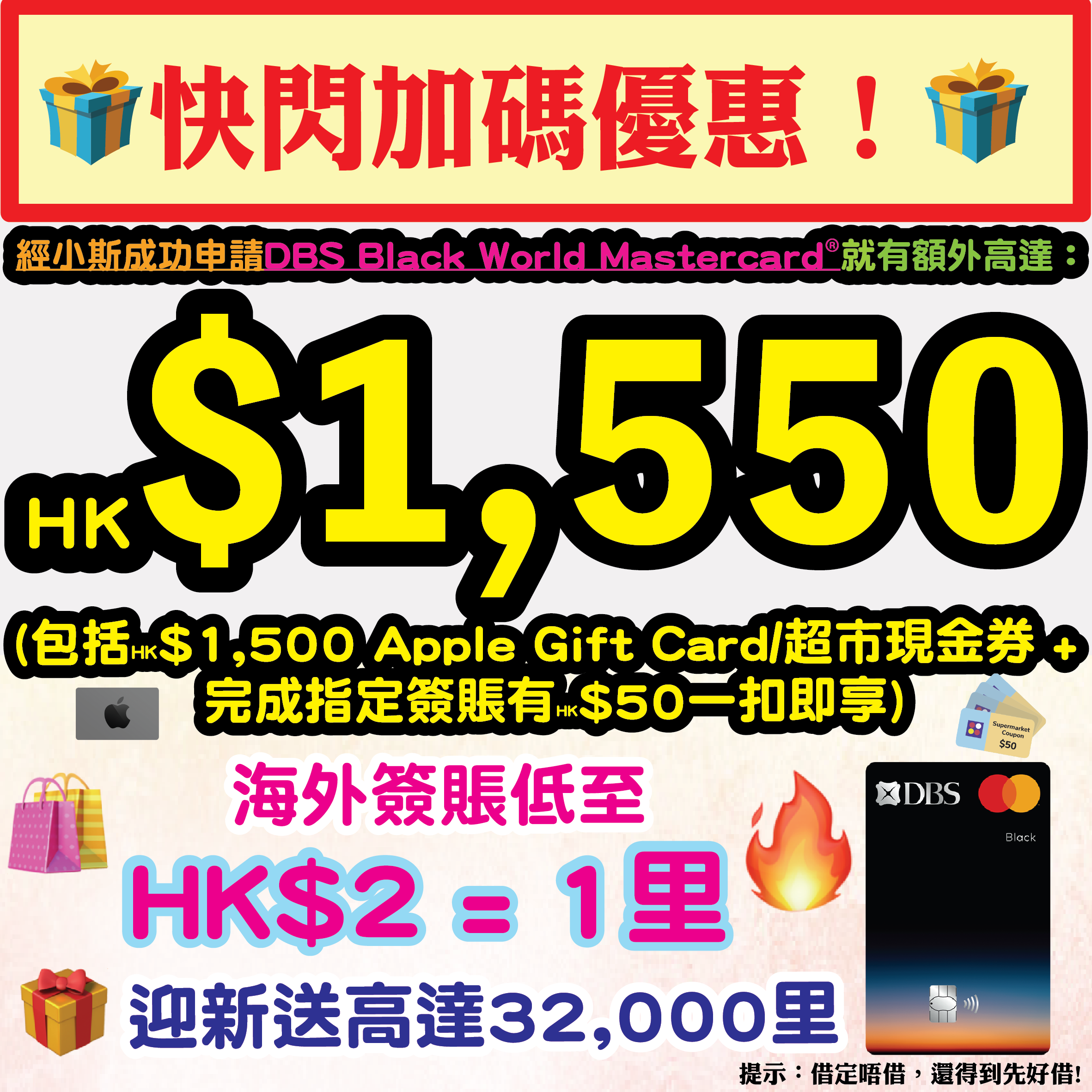 反應熱烈!小斯成功爭取到限時優惠!大家要把握機會啦!今次係送$1,500 Apple Gift Card 或超市禮券!仲有,海外簽賬優惠低至HK$2=1里!用佢嚟聖誕去旅行就啱哂啦!只要新客戶# 喺1月9日至1月15日期間,經小斯指定連結下載DBS Card+ app並經DBS Card+ app成功申請DBS Black World Mastercard,並於2026年2月28日或之前批核,就送額外HK$1,500 Apple Gift Card 或 超市禮券(2選1) + HK$50「一扣即享」!
