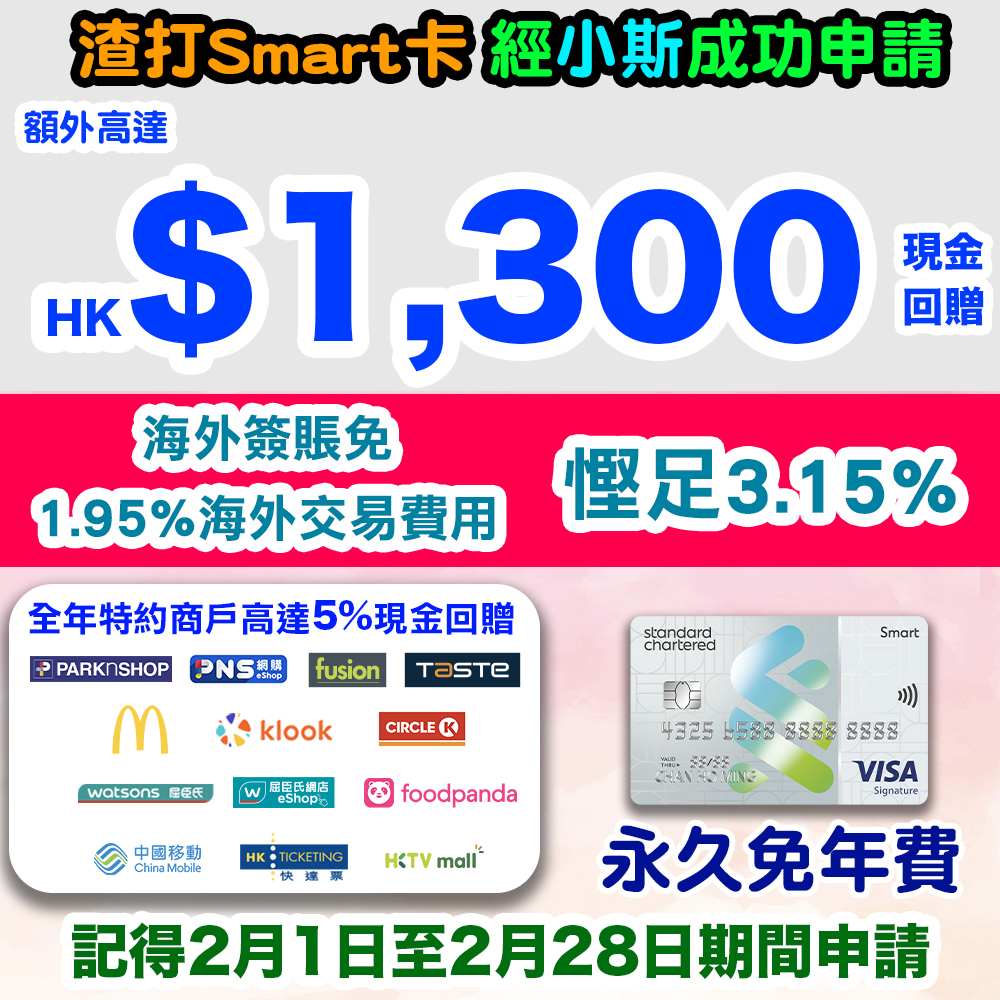 (全新渣打信用卡客戶^記得一定要喺2026年2月1日至2月28日,用小斯呢條link成功申請先有額外HK$500,合共高達HK$1,300現金回贈迎新架)