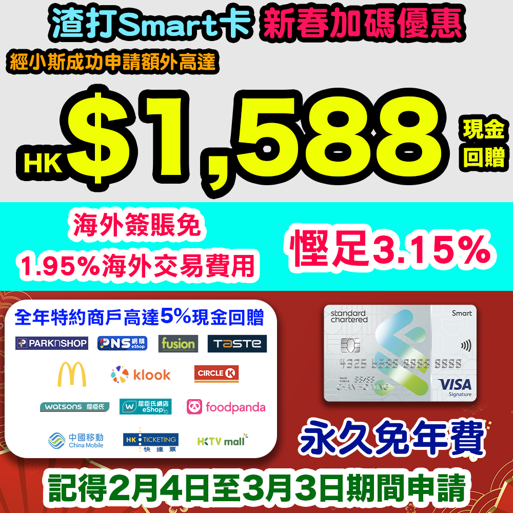 新春加碼全新信用卡客戶^經小斯迎新高達HK$1,588現金回贈 (只限2月4日至3月3日經小斯申請)