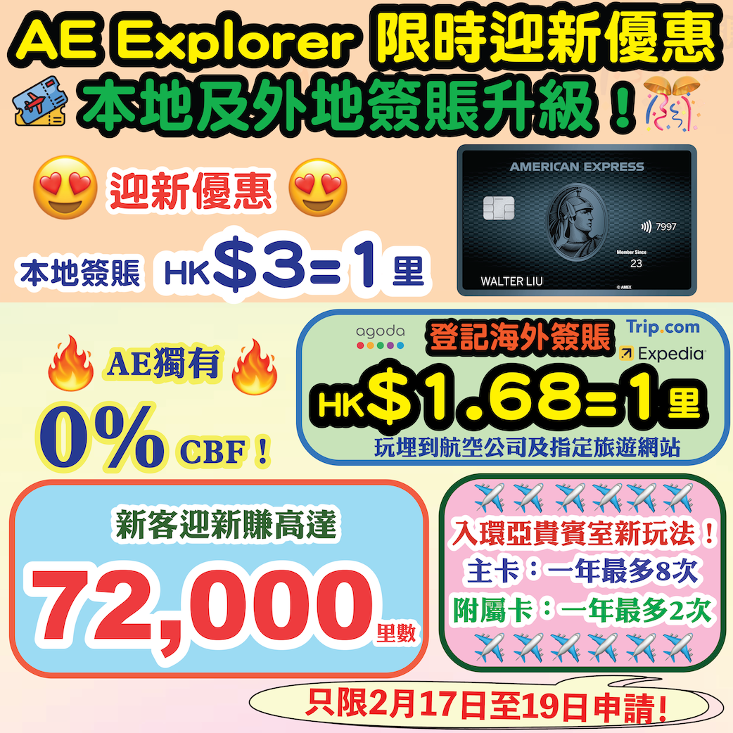 咦!正啊!新一年,AE Explorer旅遊神卡繼續有優惠比大家呀!想賺大額里數換機票嘅,機會嚟啦!只要喺2026年2月17日至2月19日經小斯成功申請,迎新最高可以賺72,000里,夠換雙人來回日本機票!今期迎新優惠繼續俾大家賺大額里數,包括有本地簽賬升級到HK$3=1里,上限仲大大提高,準備有大額簽賬、結婚擺酒、搬屋裝修就更加要申請!!再加上繼續有登記海外簽賬優惠低至HK$1.68=1里^!