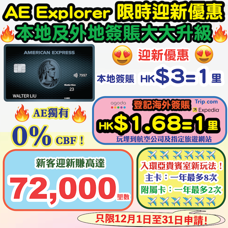 咦!正啊!AE Explorer旅遊神卡繼續有優惠比大家呀!!只要喺2025年12月1日至12月31日經小斯成功申請,迎新最高可以賺72,000里,夠換雙人來回日本機票!今次迎新優惠大大升級,包括有本地簽賬升級到HK$3=1里,上限仲大大提高,準備有大額簽賬、結婚擺酒、搬屋裝修就更加要申請!!再加上繼續有登記海外簽賬優惠低至HK$1.68=1里^!