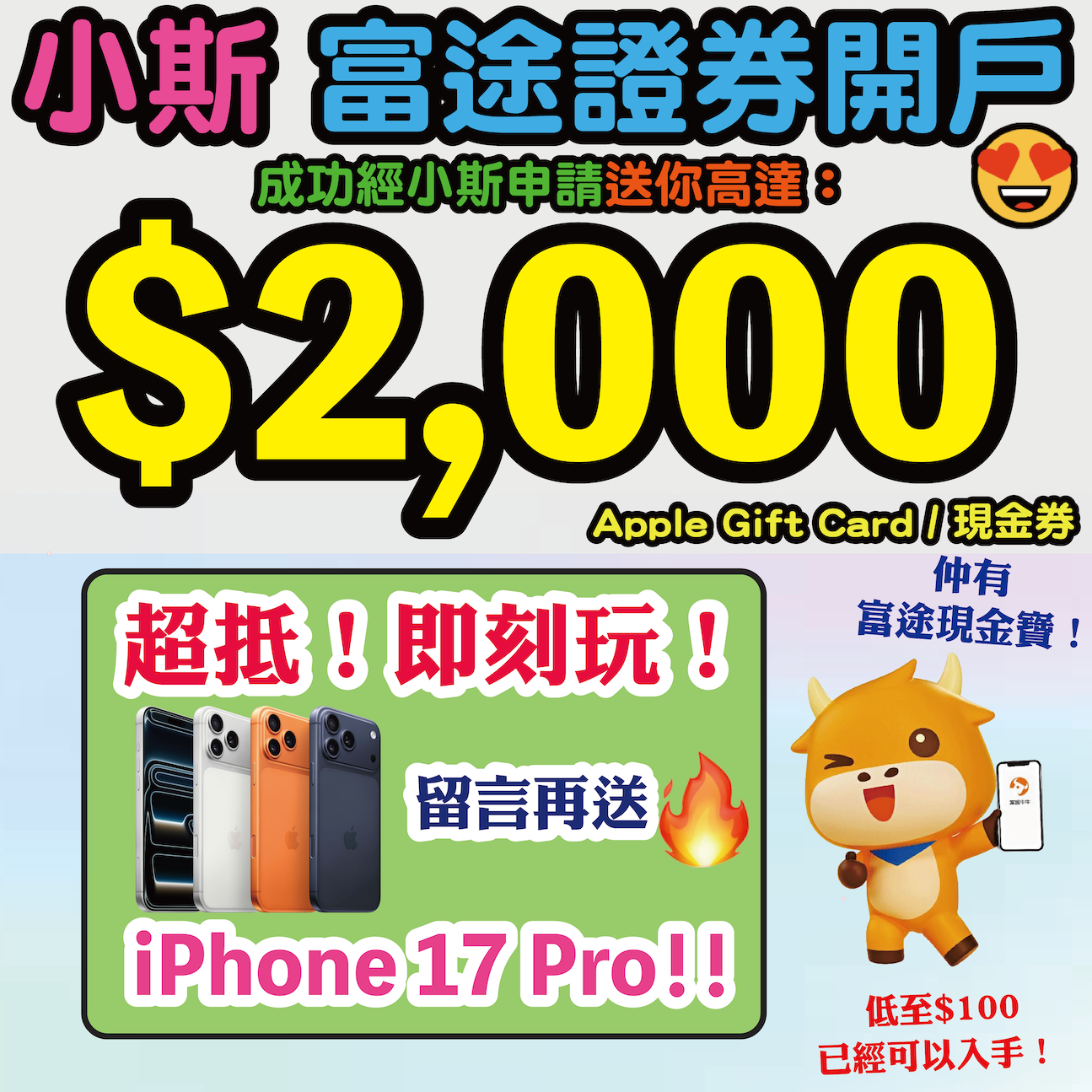 嘩!富途牛牛小斯開戶優惠!今期一樣可以直接送現金券 (可直接提現去自己銀行戶口)呀!有高達$2,000 Apple Gift Card 或 現金券 (可直接提現去自己銀行戶口)呀!同埋我搵到客戶再贊助6部iPhone 17 Pro俾大家!價值$11,399!自由揀色!或者折現Apple Gift Card都可以!