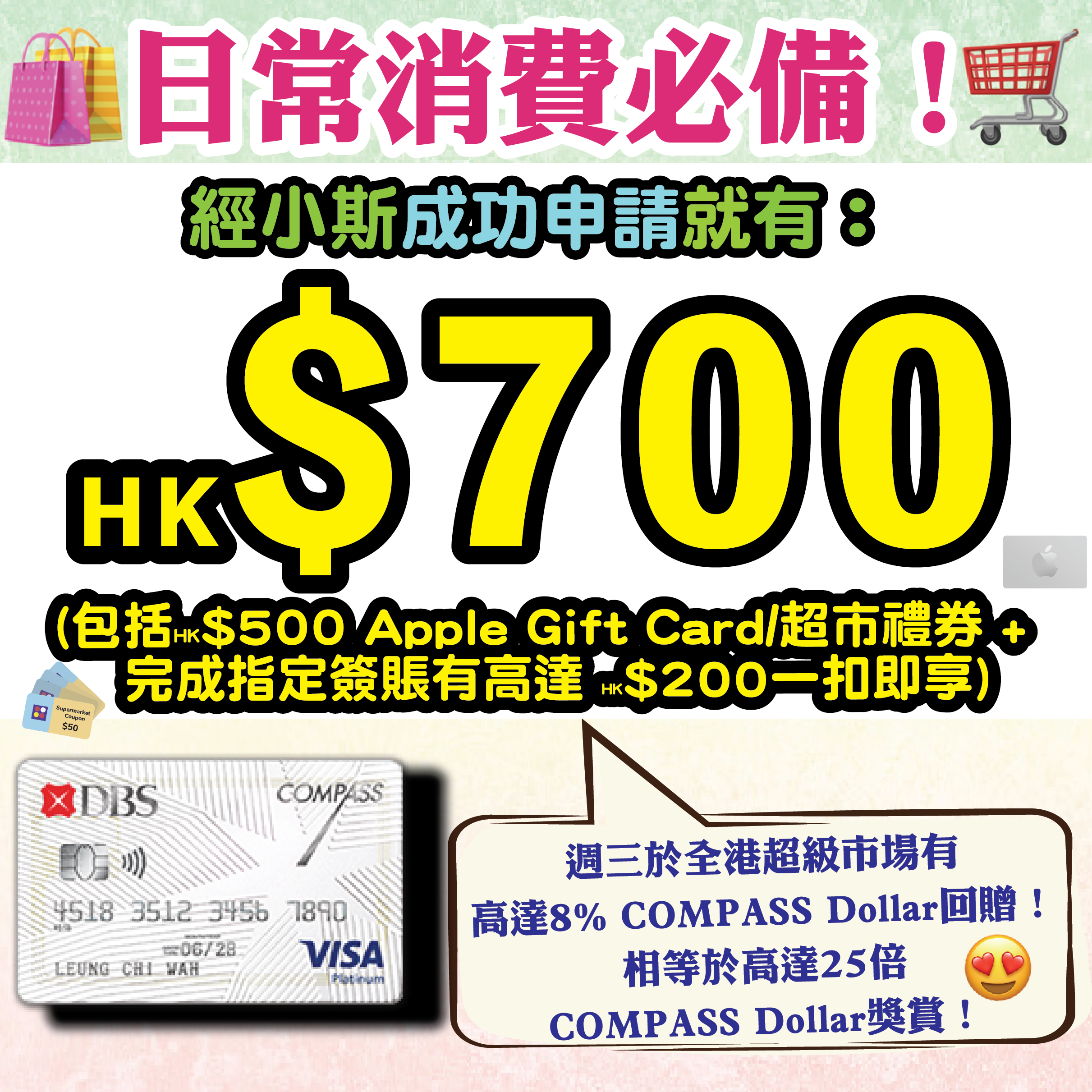 小斯DBS優惠!新客戶# 喺2026年2月28日或之前申請,經小斯指定連結成功申請DBS COMPASS VISA,並於2026年3月31日或之前批核,就送額外HK$500 Apple Gift Card 或 超市禮券(2選1) + 高達HK$200「一扣即享」❗❗