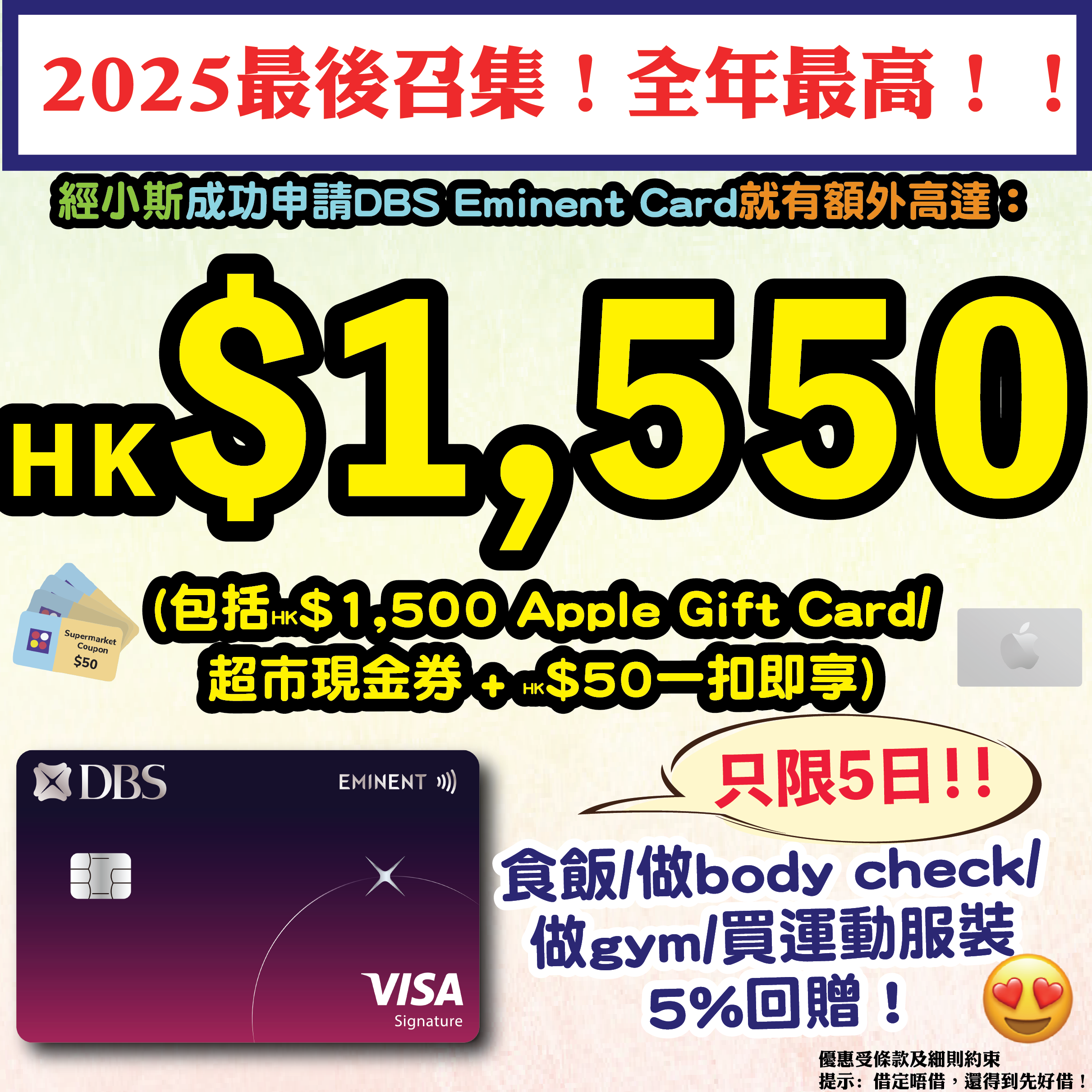 只要新客戶# 喺2025年12月3日至12月7日期間,經小斯指定連結下載DBS Card+ app並經DBS Card+ app成功申請DBS Eminent Card,並於2026年1月31日或之前批核,就送額外HK$1,500 Apple Gift Card 或 超市禮券(2選1) + HK$50「一扣即享」!