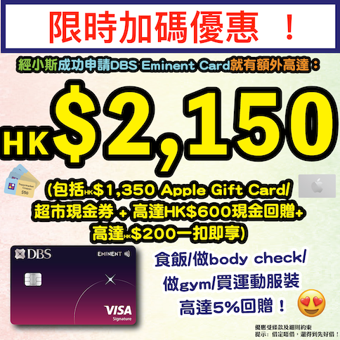 嘩嘩嘩!超正限時快閃優惠!只限5日!之前錯過咗嘅,大家今次要把握機會啦!小斯成功爭取到加碼優惠比大家啊!今次DBS Eminent Card係送$1,350 Apple Gift Card 或 超市禮券!申請定同fd或屋企人食飯就啱哂啦!全年餐飲簽賬有高達 5%回贈啊!仲有用嚟買運動服飾同做gym,都有全年高達5%回贈啊!啱晒鐘意做運動keep fit同時又周圍去食好嘢嘅你!🤩