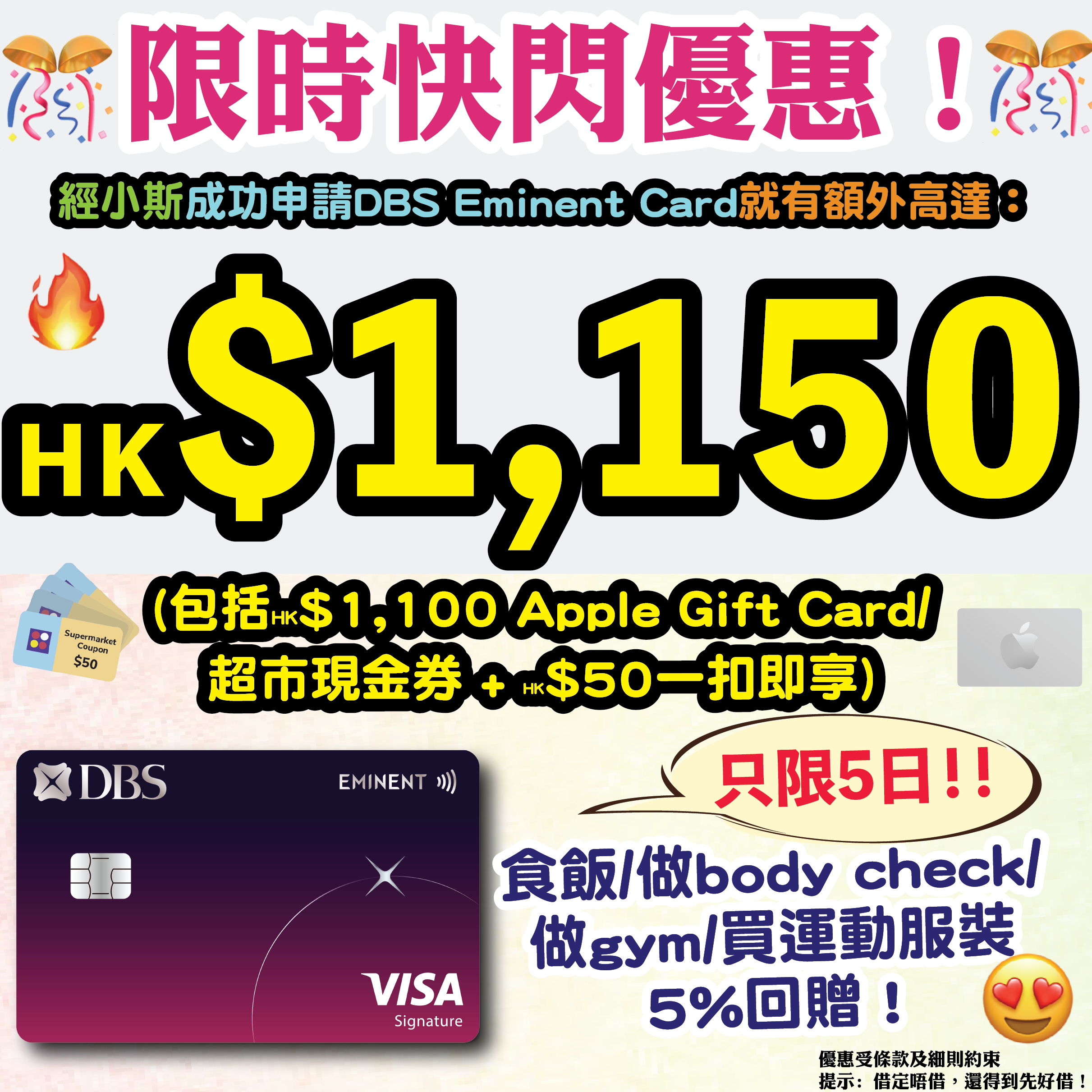 嘩嘩嘩❗DBS Eminent Card限時優惠❗❗只要新客戶# 喺2025年10月28日至11月1日期間,經小斯指定連結下載DBS Card+ app並經DBS Card+ app成功申請DBS Eminent Card,並於11月30日或之前批核,就送額外HK$800 Apple Gift Card 或 超市禮券(2選1) + HK$50「一扣即享」!