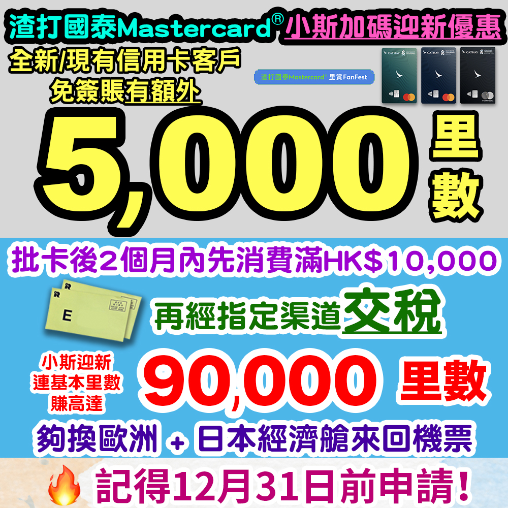 (12月1日至12月31日,全新/現有信用卡客戶*申請渣打國泰Mastercard,免簽賬送5,000里數!揀里賞FanFest禮遇簽滿指定金額,小斯迎新連迎新交稅連同基本里數合共賺可高達90,000里數!)
