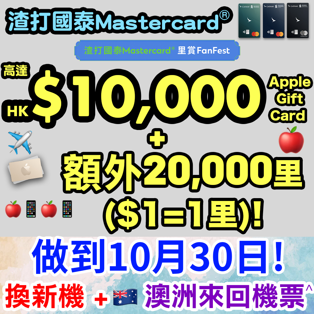 - 共賺高達45,000里數 + HK$10,000 Apple Store Gift Card