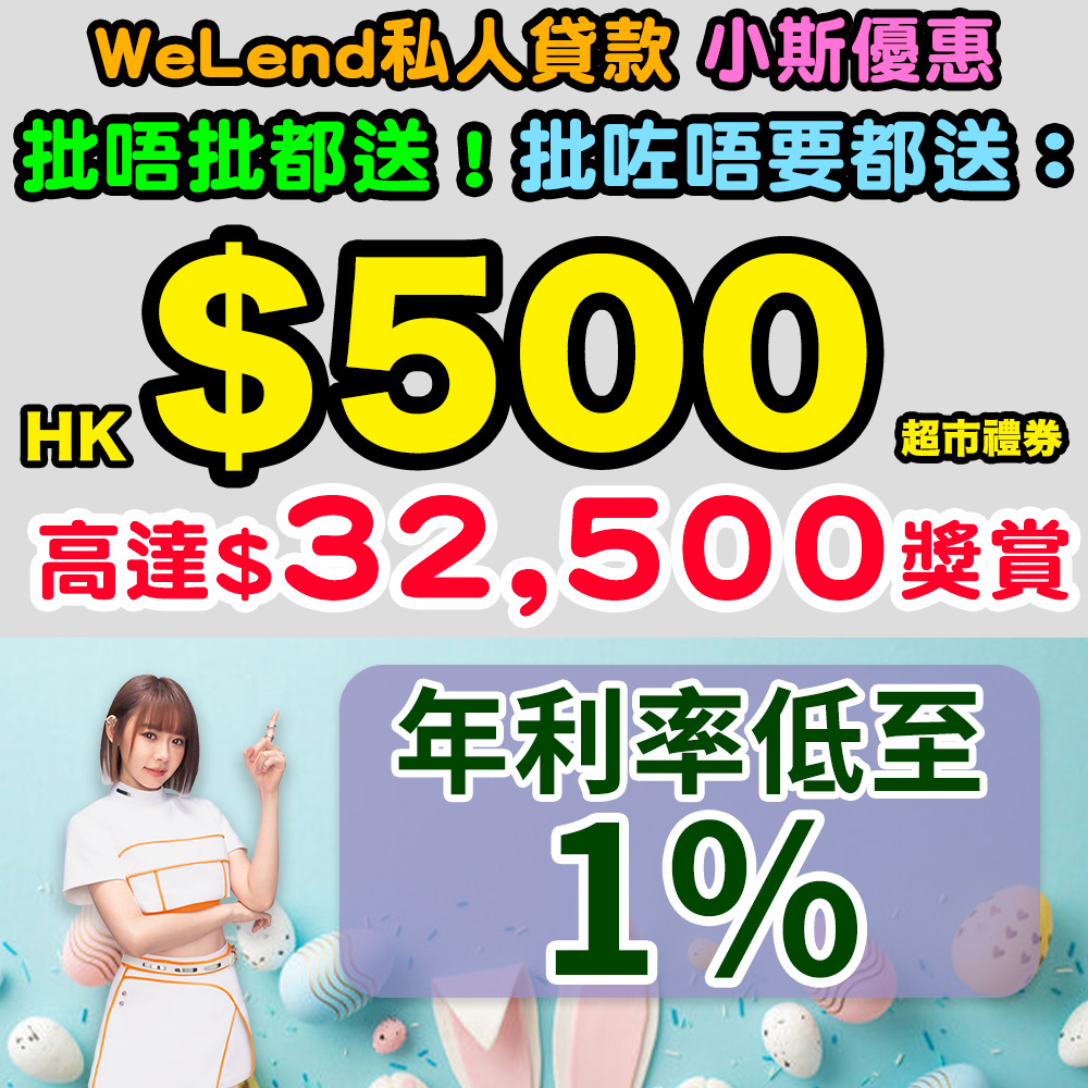 WeLend 私人貸款小斯優惠!復活節又準備洗大筆錢啊!又要交第2期稅,好大壓力啊!可以經小斯申請WeLend私人貸款,即有$500 超市禮券!批同唔批都有!批咗唔要都有!由WeLend直接送出!超癲呀!經小斯成功申請WeLend 私人貸款仲有高達HK$32,500獎賞!