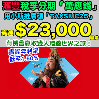 🎁 小斯獨家獎賞:經小斯成功透過HSBC HK App或網上理財申請滙豐稅季分期「萬應錢」並用推廣碼「TAXSIUC25」完成優惠登記兼批核有 (還款期24個月或以上):
