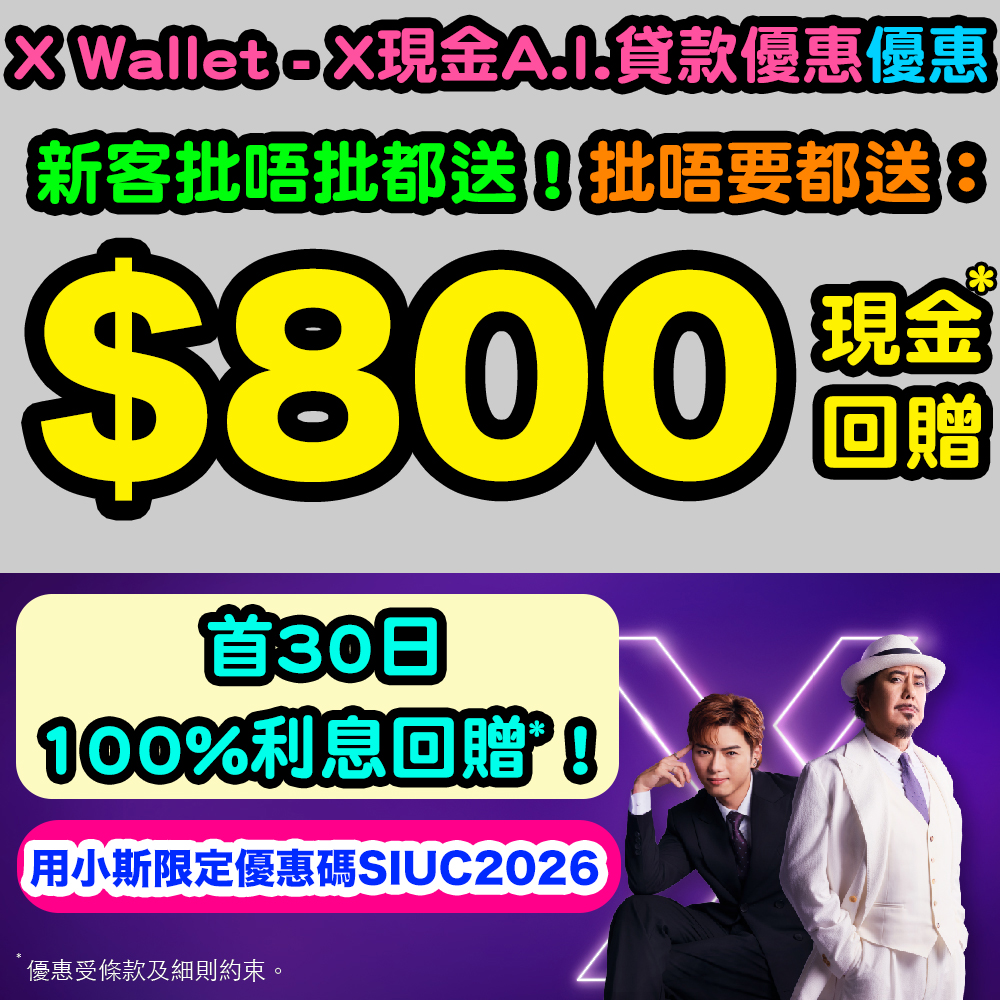 - • 全新客戶^首次申請X現金A.I.貸款(即過去12個月內未曾以同一香港永久性居民身份證申請及/或持有X Lend之任何貸款賬戶),在申請過程中輸入優惠碼「SIUC2026」,不論成功批核與否可獲 $800 現金申請優惠,成功確認貸款更可獲首30天100%利息回贈。
