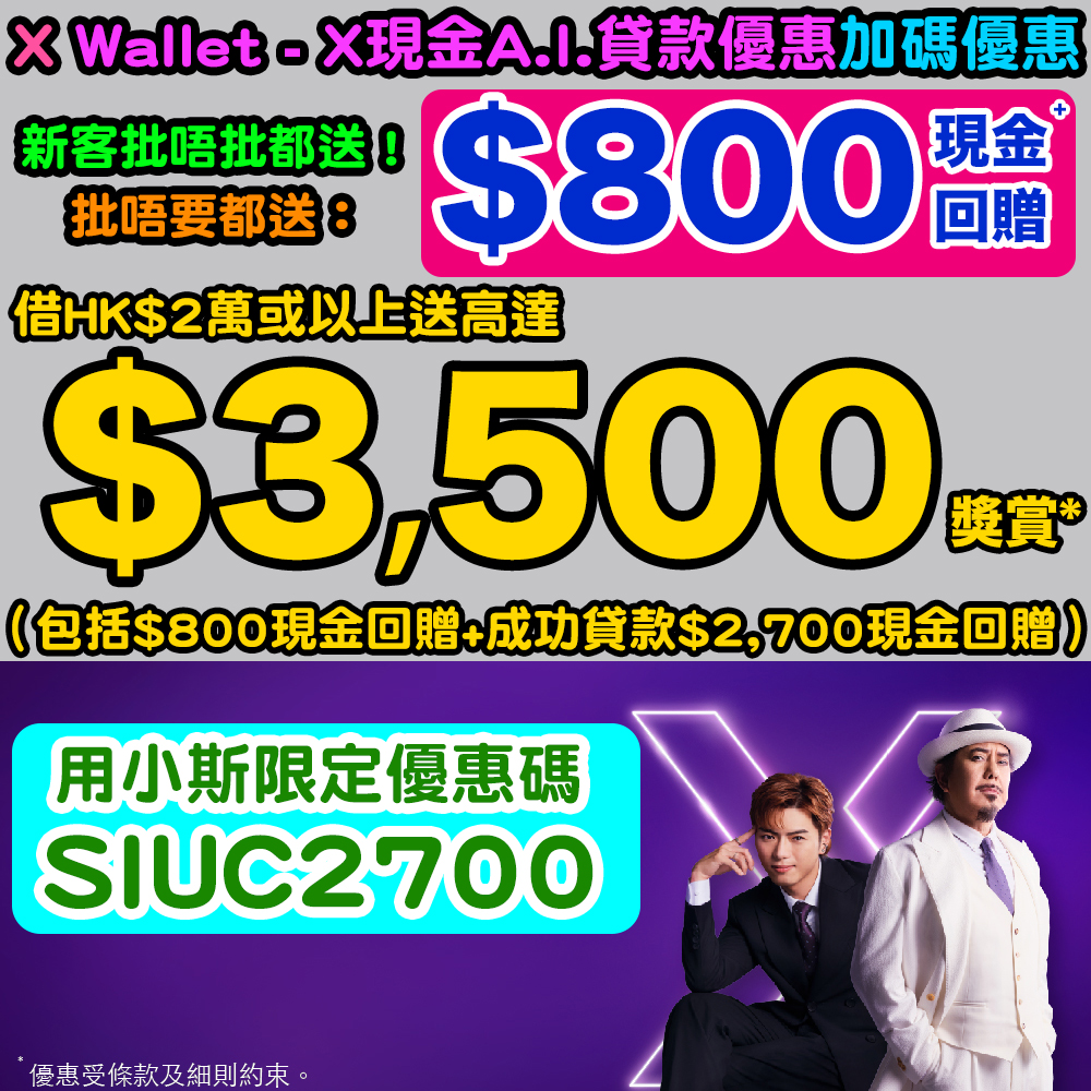 - 推廣詳情:在推廣期間,全新客戶首次申請 X 現金 A.I. 貸款,並在申請過程中輸入優惠碼「SIUC2700」,確認貸款並持有貸款 120 天或以上,且每日貸款結欠需維持已批貸款額 $20,000 或以上,有HK$2,700現金回贈*。