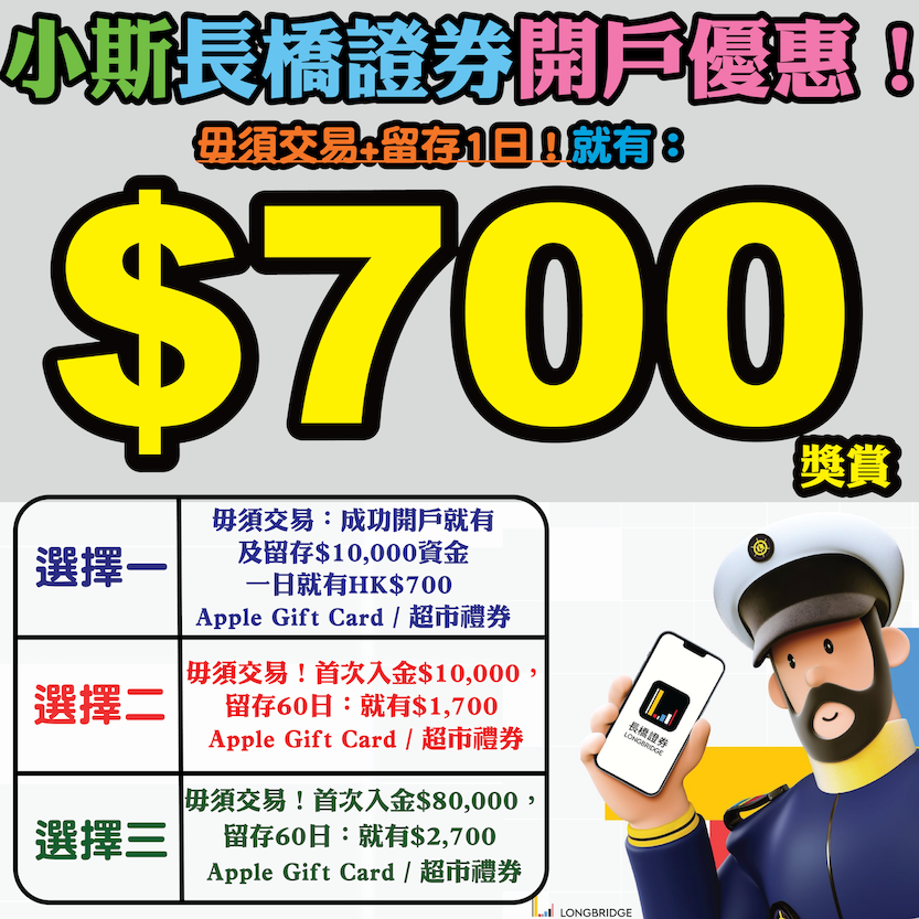 【長橋證券開戶限時優惠加碼】經小斯成功開戶,毋須交易+留存1日有$700!留存60日合共有高達$2,700獎賞!勁易賺!留存仲可擺落餘額通收息有高達約8.4%呀!