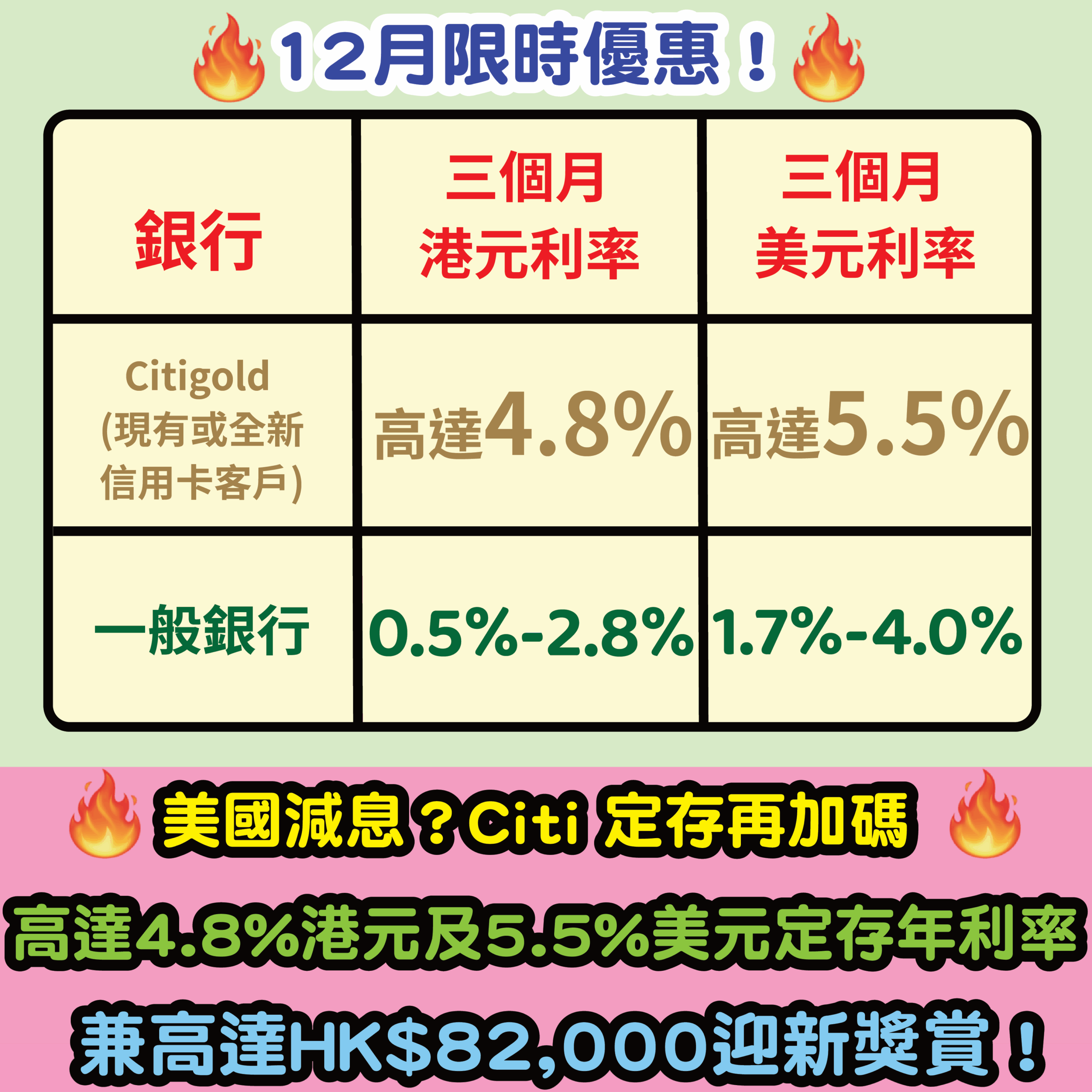 嘩!Citigold 12月開戶限時加碼優惠!!由2025年12月1日至12月6日期間,只要經小斯成功開戶並存入新資金就已經享$9,000現金回贈 + 30日內存款賺多額外$2,000現金回贈 !Citi信用卡享額外1.5%定期存款利率回贈*! 迎新高達HK$82,000現金回贈 !- 新資金獎賞