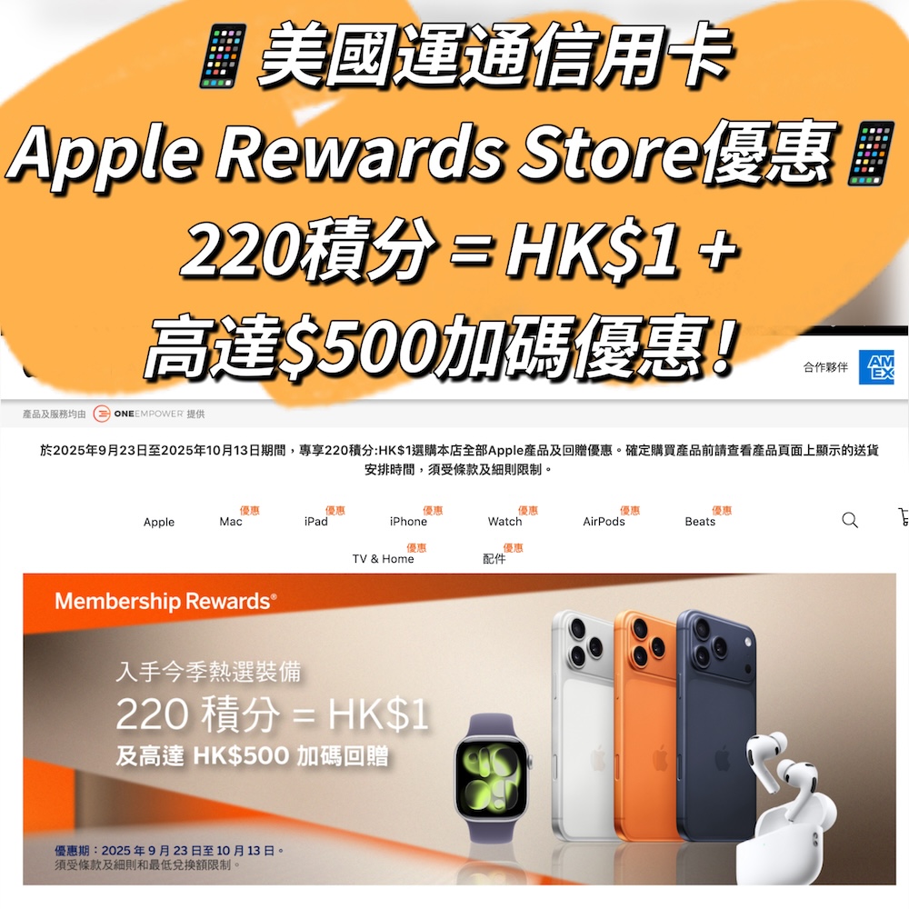 嘩嘩嘩!準備入手新Apple產品嘅你要留意啦 !美國運通Apple Rewards Store有兌換優惠啊!由2025年9月23日至10月13日,憑合資格運通卡於美國運通Apple Rewards Store購買Apple產品,有以下優惠: