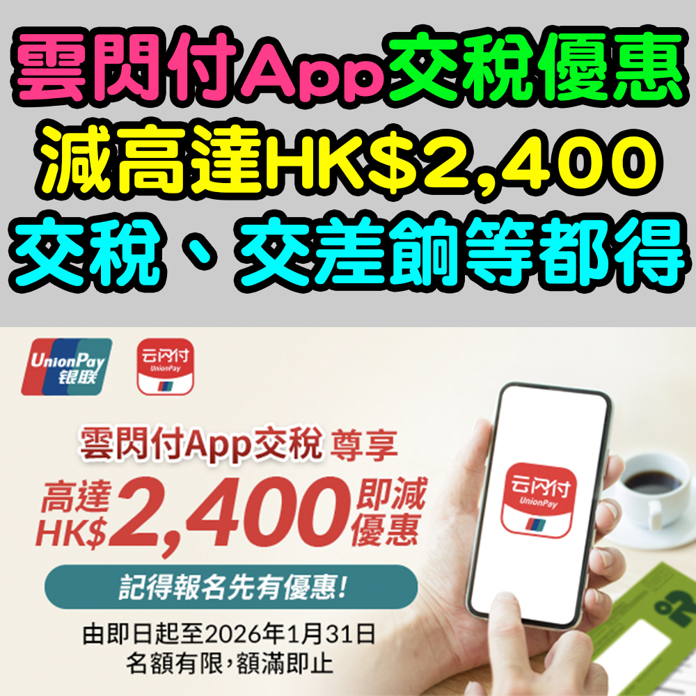 2025年11月26日至2026年1月31日,銀聯卡持卡人在雲閃付APP報名後,使用合資格銀聯卡在雲閃付APP (中國香港頁面)/香港繳費/政府或法定機構類別繳費滿指定金額,即享以下立減優惠