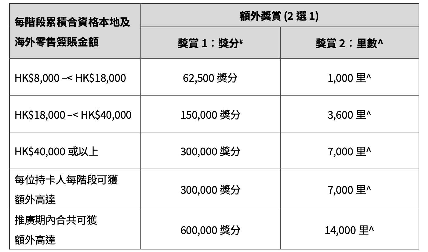 | HK$40,000或以上 | 300,000獎分* | 7,000里^ |
