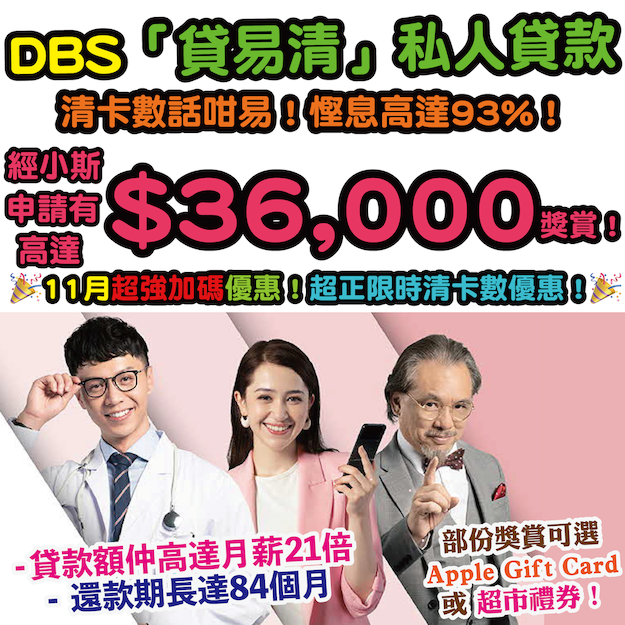 - 借夠30萬,獲小斯獨家HK$7,700超市現金券 / Apple Gift Card + DBS提供 HK$2,300 超市現金券** + 新客戶HK$1,000超市現金券,總共高達$11,000獎賞!