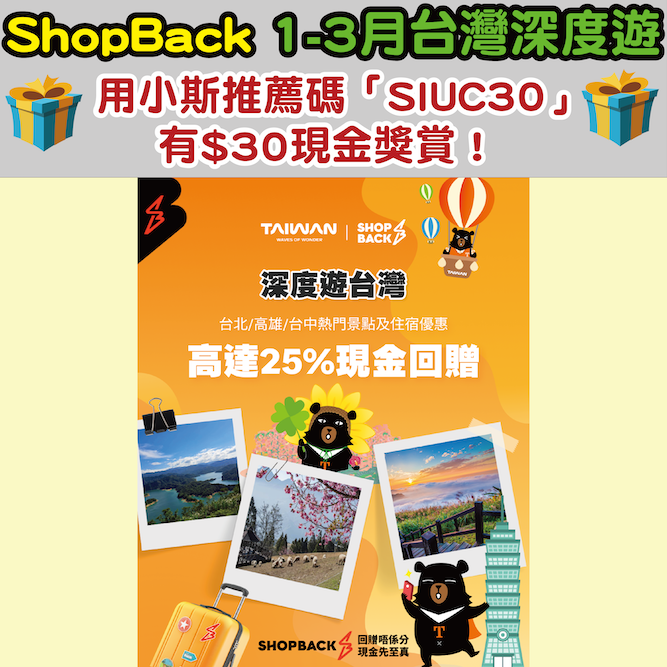 嘩嘩嘩!嚟緊會去台灣嘅你要留意啦!ShopBack 1月有台灣優惠,有高達25%升級回贈啊!由2026年1月21日至3月21日期間,用ShopBack預訂台北/高雄/台中熱門景點及住宿有以下優惠:
