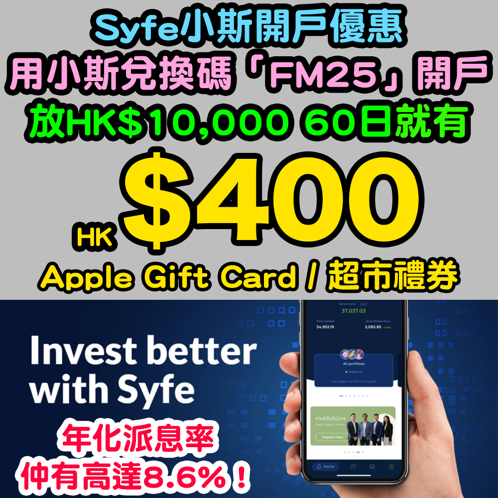 今次小斯同Syfe承富再有開戶優惠呀!10月31日或之前,用小斯兌換碼「FM25」開戶,放HK$10,000 60日就有HK$400 Apple Gift Card / 超市禮券!好易賺啊!放多啲最多仲可以賺到HK$2,800添!