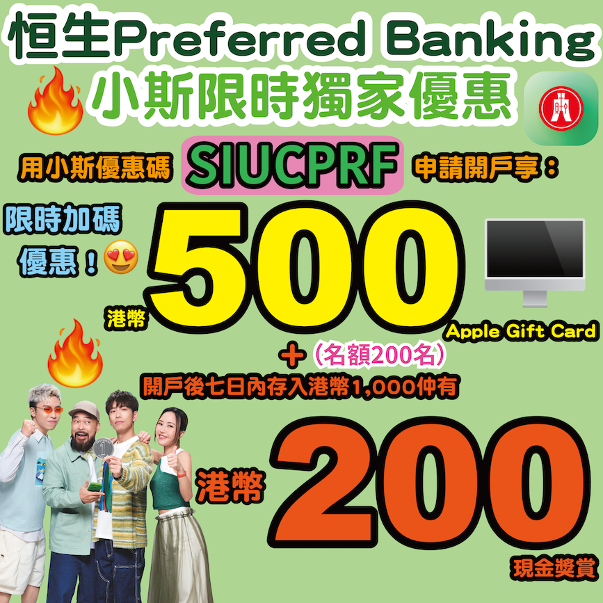 (記得要用小斯優惠碼「SIUCPRF」申請恒生Preferred Banking戶口,符合指定條件就拎到高達總值港幣700獎賞架喇!)