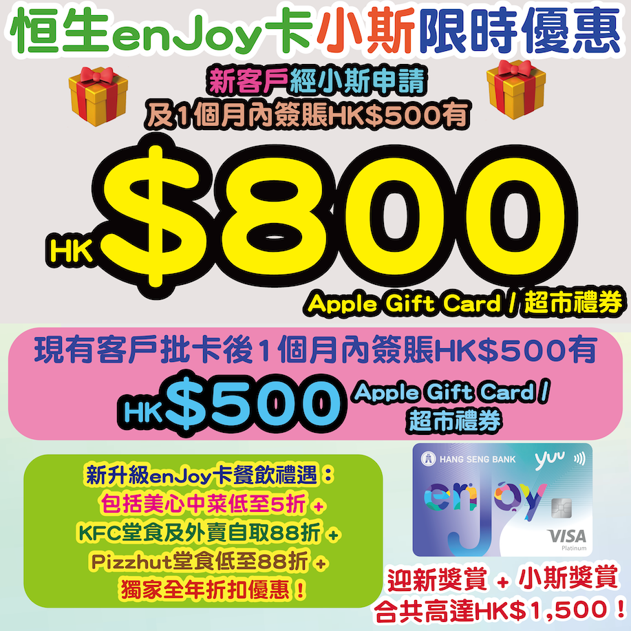 嘩嘩嘩!新升級enJoy卡 l 日常 日嚐 !更非常 enJoy!限時優惠!有額外高達HK$800 Apple Gift Card / 超市禮券呀!迎新仲有高達140,000 yuu積分及永久免年費!而惠康、7-Eleven有3倍yuu積分 + 指定日子有折!新升級enJoy卡餐飲禮遇,包括美心中菜低至5折 + KFC堂食及外賣自取88折 + Pizzhut堂食低至88折 + 獨家全年折扣優惠!快啲即刻申請咗先,可以盡情消費賺額外yuu積分!!大家要快啲申請啦!