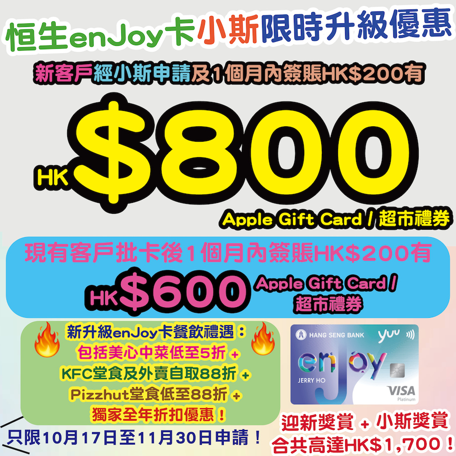 2025年10月17日至11月30日,經小斯成功申請恒生enJoy卡: