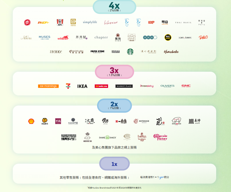 - 其他指定美心食府及分店、Shell:HK$1 = 2 yuu積分 (1%回贈)