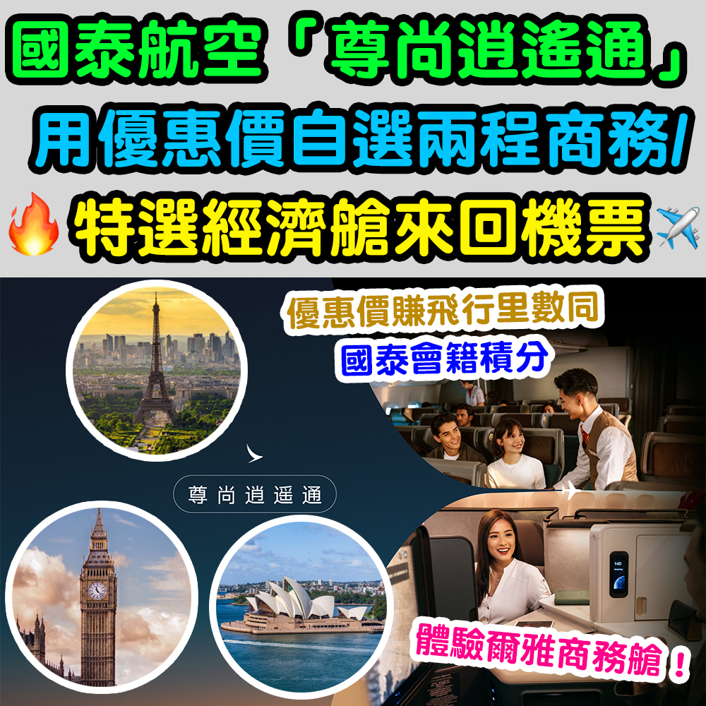 【國泰航空「尊尚逍遙通」優惠】自選兩程商務客艙/特選經濟艙來回機票!用優惠票價賺飛行里數同國泰會籍積分!
