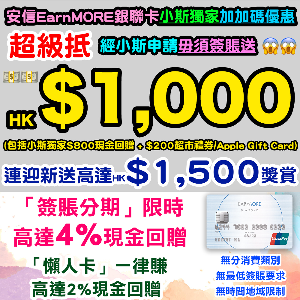 *小斯額外$1,000包括$800現金回贈及$200超市禮券/Apple Gift Card。$800現金回贈將於安信信用卡發卡後3個月內,以現金回贈方式存入合資格客戶之安信信用卡賬戶內,$200超市禮券/Apple Gift Card則需於新卡批核後7日內填悉小斯指定表格領取。