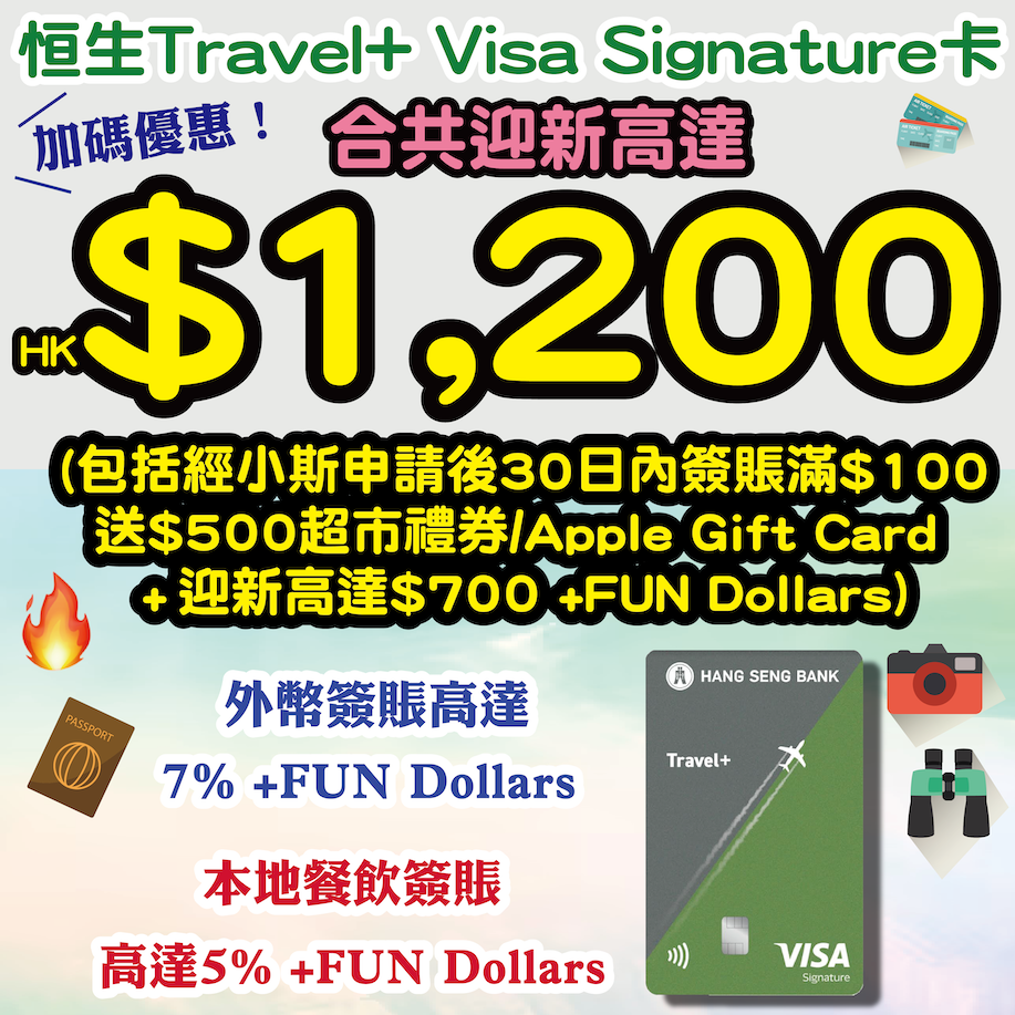 嘩嘩嘩!正啊!!!旅遊必備嘅恒生Travel+ Visa Signature卡有小斯加加加碼優惠!新舊客戶都有!!批卡後30日内簽賬滿$100送$500!去旅行用嚟畀錢,外幣簽賬賺高達7% +FUN Dollars!仲新增咗內地、澳門及台灣!同埋平時用哩張卡食飯比錢,就有高達5% +FUN Dollars!輕鬆賺到回贈後,就可以用黎買機票及酒店住宿啦!想weekend隨時飛一轉快閃台灣或日本都得啊!